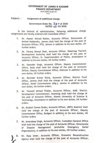 3.) Mr. Satender Singh, Accounts Officer, Deputy Commissioner Office, Doda shall hold the charge of the post of Accounts Officer, Deputy Commissioner Office, Kishtwar in addition to his own duties, till further orders.